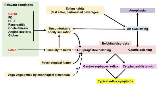 Factors affecting Gastric belching and Supragastric belching. GERD; gastroesophageal reflux disease, FD; functional dyspepsia, PUD; peptic ulcer disease, LARS; laparoscopic anti-reflux surgery.