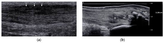 Differentiation between full-thickness tears and partial tears can be adequately assessed with ultrasound (n = 26, accuracy 92%, sensitivity 100%, and specificity 83%), showing a significant difference in tendon thickness, an increased posterior acoustic shadowing at the side of tendon abnormality, and tendon retraction in case of a full-thickness tear [7]. Comparing findings of preoperative ultrasound to findings at surgery, Kälebo et al. reported an excellent diagnostic accuracy of 95% for ultrasound (sensitivity 0.94; specificity 1.00) [25]. Further studies revealed corresponding preoperative findings in 8/11 patients (sensitivity 72%) or 10/11 (sensitivity 90%) [26,27]. However, these good results might be based on a selection bias in a surgically treated, small collective, which might have larger and hence easier-to-detect partial ruptures.