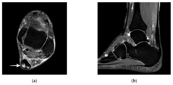 The majority of studies report that with ultrasound it is difficult to distinguish partial ruptures from focal degenerative changes, since partial ruptures appear with a wavy, irregular echo pattern with accompanying focal hypoechogenic areas, detectable neovascularization, and tendon thickening that are also findings in Achilles tendinopathy [19,23,26,28,29]. A more specific finding might be a disrupted dorsal Achilles tendon border [19,28] (Figure 2a). The detection of proximal partial ruptures close to the myotendinous junction and the differentiation between older partial ruptures and intratendinous tendinopathy are challenging with ultrasound [28,30] (Figure 2b). In MRI, a partial tear is defined as tendon thickening with a hyperintense signal on T1 and a strong hyperintense signal on magnetic resonance (MR) images with fluid-sensitive (T2-weighted and inversion recovery) sequences [29,30,31] (Figure 3). Typically, signal intensity is analogous to free fluid. A hyperintense area directly located at the tendon border should be interpreted as a partial rupture [30]. Due to muscle inactivity, isolated fatty degeneration and edema in the calf muscles might represent a subsequent state of a partial or total rupture [31]. The sensitivity of MRI in detecting partial tears is high (positive predictive value 0.94, n = 18), but studies directly comparing the accuracy of MRI and ultrasound are rare [32]. In a prospective study of Kayser et al., only one-fifth of partial lesions were noticed with B-Mode ultrasound whereas MRI detected five-fifths of partial ruptures [24].