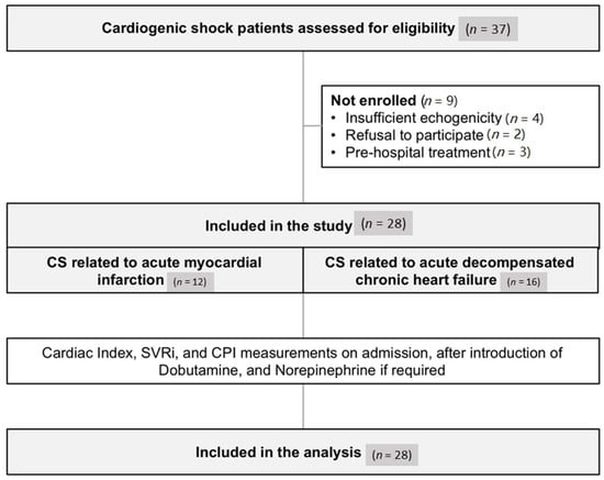 Thirty-seven consecutives patients admitted for CS related to AMI or ADCHF during the inclusion period were assessed for eligibility. Among them, 28 patients were finally included. Non-inclusion was related to an insufficient echogenicity (4 patients), prehospital inotropic support (3 patients), and refusal to participate (2 patients) (Figure 1).