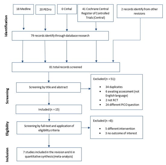 We searched the Medline, PEDro, Cochrane Central Register of Controlled Trials, and CINAHL databases up to May 2020. In Appendix A we reported the Medline full search strategy, adapted for all other databases. We also hand-searched bibliographies of the relevant studies, systematic reviews, the register of randomized controlled trials (RCTs; e.g., clinicaltrials.gov), and groups of interest. Study selection was carried out by two independent authors and disagreements were solved by a third author.