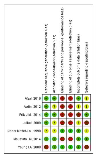 The risk of bias of RCTs is presented in Figure 2. Overall, one RCT was judged as having an unclear risk of bias [22], one as having a low risk of bias [14], and five as having a high risk of bias [12,13,16,18]. Risk of bias due to lack of blinding was predominant (n = 5 RCTs); the blinding procedure was considered adequate in two studies. All seven studies were described as randomized, although only three reported appropriate methods for sequence generation and allocation. Four had an acceptable drop-out rate and two were consistent in outcome reporting.