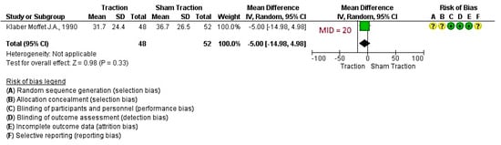 Only one study [22] was found that compared continuous mechanical traction against sham traction. With a low quality of evidence (Supplementary Table S2), the effect of traction compared to the control was not significantly different (Figure 3: MD −5.00 [95% CI, −14.98, 4.98] P = 0.33 > 0.05).