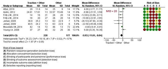 Six studies [12,13,14,16,18,28] with eight informative comparisons (involving 405 patients) measured pain intensity. With a low quality of evidence (Supplementary Table S3), the effect of traction in addition to other treatments was significantly different compared to the control (Figure 4: MD −5.93 [95% CI, −11.81 to −0.04] P = 0.05 and I2 = 57%). Mechanical traction used in six of the eight comparisons and manual traction was used in the remaining two.