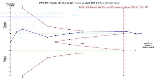We applied Trial Sequential Analysis (TSA) to evaluate the robustness of evidence and estimate the diversity-adjusted required information size (DARIS) (i.e., the number of participants needed in a meta-analysis to detect or reject a certain intervention effect) and to control for random errors with trial sequential monitoring boundaries [44,45]. DARIS was calculated based on: (i) a predefined anticipated intervention effect equal to a minimal important difference (MID) between groups of 20 points on the pain outcome measured on a standardized scale of 0–100 mm [46], (ii) a standard deviation observed in the control group of trials with a low risk of bias, (iii) an alpha of 5%, (iv) a beta of 20%, and (v) an assumed diversity of 71% calculated among the trials in the meta-analysis (variance-based model). The analysis was performed using TSA software beta version 0.9.5.10 [47].