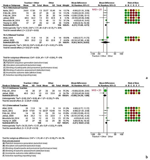 Mechanical traction was assessed in five studies (total of 357 patients) [12,13,14,16,18]. With a low quality of evidence the subgroup analysis of mechanical traction showed a significant statistical difference between intervention (i.e., traction in addition to other treatments) versus control (i.e., other treatments) (Figure 6a; MD −6.21 [95% CI, −11.69 to −0.73] P = 0.03 < 0.05 and I2 = 36%, Supplementary Table S4). Mechanical traction was administered with the patient supine [12,13,14,16,18] in five comparisons and in a sitting position in one. Through those comparisons, traction was applied intermittently in four groups [12,14,16,18] and continuously in the other two groups [12,13]. The duration of traction was 15–25 min on average at an angle of 15–25° of cervical flexion, or in the most pain-free position, with a load of 2.7–15.91 kg.