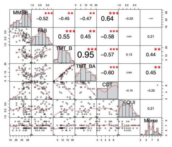 Figure 1 shows significant correlations and their r values. Concerning our variables of interest, we found a significant moderate correlation between TMT-B and Morse scale (r(37) = 0.44, p < 0.01, 95% CI [0.14, 0.66]) and a significant moderate correlation between TMT-BA and Morse scale (r(37) = 0.45, p < 0.01, 95% CI [0.16, 0.67]). Then, five imputed datasets iterated five times were used for pooled correlations. Results showed weak positive correlations between TMT-B and Morse (r = 0.28, p < 0.05, 95% CI [0.01, 0.51]) and between TMT-BA and Morse (r = 0.31, p < 0.05, 95% CI [0.06, 0.53]). MMSE was not significantly correlated with Morse or EQUI scale and any other executive/attention or neuropsychological tests significantly correlated with Morse, hence other cognitive tests were not analysed in regression analyses.