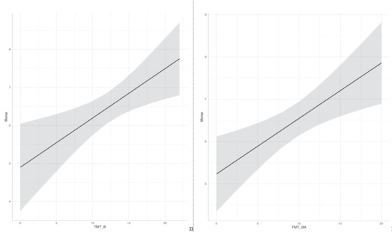 We found a significant linear regression (F(3,35) = 3.15, p < 0.05) with an R2 of 0.21. Participants’ fall risk score was equal to 4.26 + 0.13 (TMT-B) + 0.02 (MMSE) + 0.53 (VP). TMT-B was the only significant predictor (p < 0.01). Again, we found a significant linear regression (F(3,35) = 3.58, p < 0.05) with an R2 of 0.23. Participants’ fall risk score was equal to 4.24 + 0.13 (TMT-BA) + 0.04 (MMSE) + 0.61 (VP). TMT-BA was the only significant predictor (p < 0.01). We repeated the same analysis with the imputed dataset by pooling the results. Again, we found that TMT-B and TMT-BA were the only significant predictors (p < 0.05 and p < 0.01, respectively), although R2 decreased (0.10 and 0.13, respectively). Figure 2 shows the relationship of the fitted linear model for Morse scale and TMT-B and TMT-BA scores. Non-hemiplegic individuals were more frequent than hemiplegic (χ2 [1, n = 66] = 20.9, p < 0.001); nevertheless, we also checked whether hemiplegia at time of clinical evaluation could explain fall risk in place of VP. Again, TMT-B (p < 0.05) and TMT-BA (p < 0.01) were the only significant predictors.