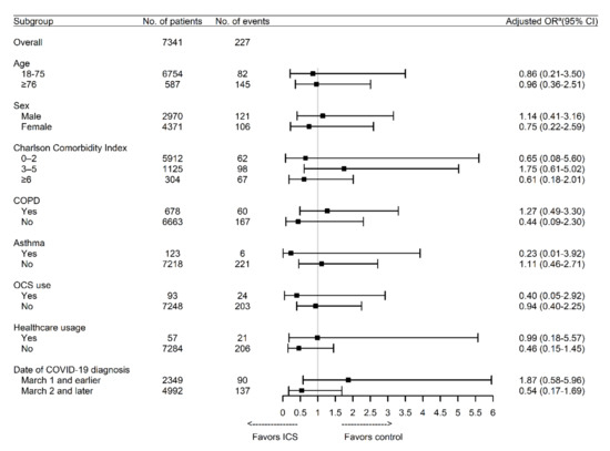 Association between the use of ICS and the risk of mortality according to subgroup. COPD: chronic obstructive pulmonary disease; COVID-19: coronavirus disease 2019; ICS: inhaled corticosteroids; OCS: oral corticosteroid. a Adjusted for age, sex, region, Charlson Comorbidity Index, and hospital type.
