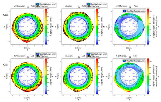 Mean sagittal height of Asian eyes (OD, n = 125; OS, n = 125) (a,b) and Caucasian eyes (OD; n = 114, OS; n = 121) (c,d) and the mean group difference (e,f). Contour lines in subfigures (a–d) represent the standard deviation. In subfigures (e) and (f), contour lines join the same numerical values of the difference. N: nasal, I: inferior, T: temporal, S: superior.