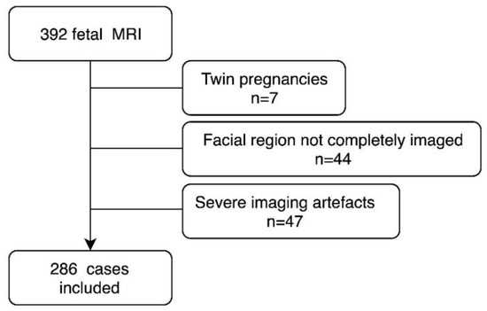 We included cases acquired between 1 January 2009 and 31 December 2015, with a known ultrasound-confirmed gestational age, who had had axial T2-weighted single shot fast spin echo (ssFSE) images over the fetal head, and who had no known or detected dental anomalies or facial skeletal abnormalities and chromosomal anomalies. A diagram of further exclusion criteria can be found in Figure 1. The medical diagnosis, based on the fetal MRI, was classified into: no abnormalities, brain abnormalities, thoracic abnormalities, abdominal abnormalities, limb abnormalities, and extra-fetal abnormalities (Table 1).