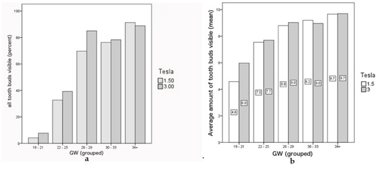 Comparison of 1.5T and 3T images with regard to the GW groups and visibility of tooth buds. (a) Percentage of cases per age group where all tooth buds were visible in both the 1.5T and 3T Images. (b) Average amount of tooth buds visible in different age groups, again in both the 1.5T and 3T Images.