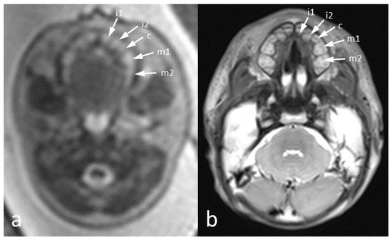 T2-weighted ssFSE axial images of two GW 36 fetus, performed at 1.5T (a) and 3T (b) displaying the tooth buds: i1 (first primary incisivus), i2 (second primary incisivus), c (primary caninus), m1 (first primary molar), m2 (second primary molar), M1 (first permanent molar). The asterisk shows the calcified edge within the tooth bud.