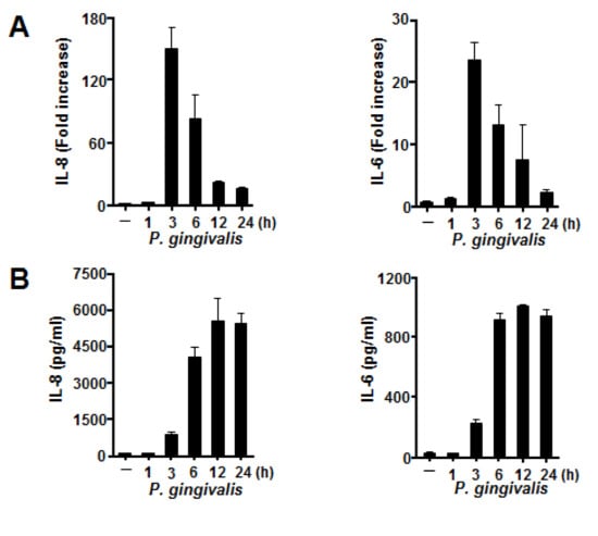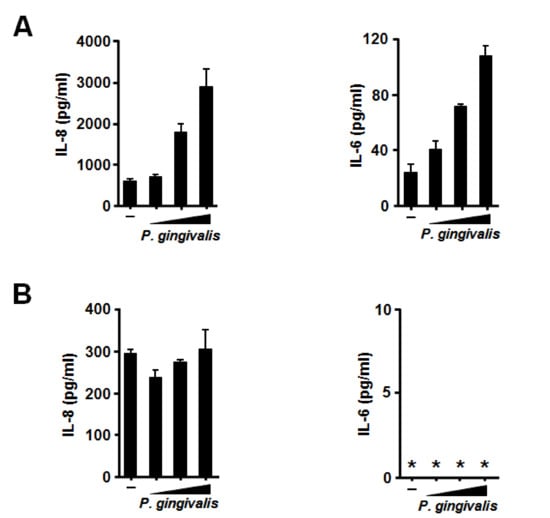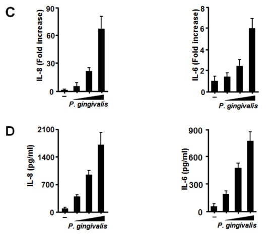 P. gingivalis is considered to orchestrate dysbiosis of periodontal flora, which triggers inflammatory responses including cytokine production in the periodontium and in turn causes alveolar bone-destruction as a major symptom of chronic periodontitis []. We therefore first examined the mRNA induction of IL-8 and IL-6 by BEAS-2B bronchial epithelial cells and pertinent protein release using real-time PCR and ELISA, respectively.