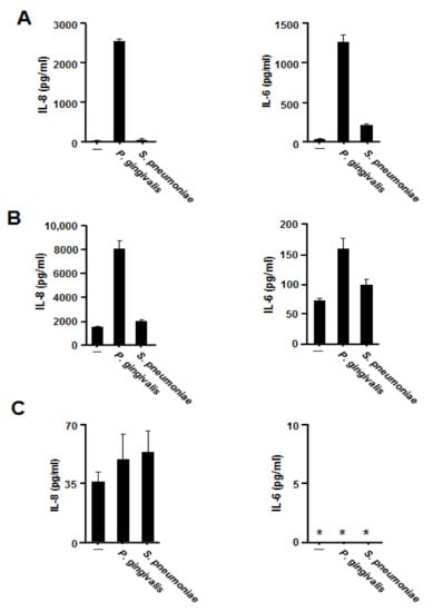 Comparison between the induction of proinflammatory cytokines by Porphyromonas gingivalis and by Streptococcus pneumoniae. BEAS-2B (A), Detroit 562 (B) or A549 (C) cells were incubated in the presence of heat-inactivated cells (1 × 108 CFU/mL) of P. gingivalis or S. pneumoniae for 12 h. IL-8 and IL-6 levels in the culture supernatants were then determined using enzyme-linked immunosorbent assay. These experiments were performed in triplicate, and data are presented as the mean ± SD. *; below the detection limit.