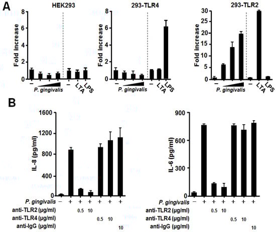 Several studies have demonstrated TLR2 and TLR4 are important host receptors for recognizing P. gingivalis []. Eventually, these TLRs are reported to express on BASE-2B cells as well as on human bronchial epithelium and on Detroit 562 cells [,,]. However, no study has yet examined whether human respiratory epithelial cells recognize P. gingivalis with their TLR2 or TLR4. In parallel, for producing IL-8 and IL-6, NF-κB is known to be an important transcription factor []. We therefore first examined whether these TLRs were involved in the NF-κB activation in P. gingivalis-stimulated epithelial cells using a luciferase assay. For this purpose, TLR-null HEK293 cells and HEK293 cells stably expressing either TLR2 or TLR4 cells were transfected with NF-κB reporter plasmids. As expected, NF-κB in 293-TLR2 cells were activated only by the stimulation with its specific ligand LTA from S. aureus, and likewise, 293-TLR4 cells were activated only by LPS from E. coli, whereas HEK293 cells were not activated by the both ligands (Figure 4A). When these cells were stimulated with P. gingivalis, 293-TLR2 cells alone were activated in a density-dependent manner (Figure 4A). These findings suggest that the observed cytokine production by BEAS-2B and Detroit 562 cells is induced via TLR2 but not via TLR4. To confirm this, BEAS-2B and Detroit 562 cells were treated with anti-TLR2 or anti-TLR4 antibodies prior to the stimulation with P. gingivalis. As shown in Figure 4B,C, anti-TLR4 antibodies had no effect on IL-8 and IL-6 production by either cell line following exposure to P. gingivalis, whereas the anti-TLR2 antibody significantly abrogated the production of both cytokines.