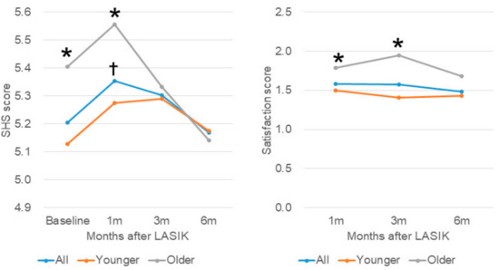 Participants were next stratified by age according to a previous study [8]—342 patients were in the younger group (<40 y) and 130 in the older group (≥40 y). The number of patients in younger/older groups were 342/130 at baseline, 235/91 at one month, 119/54 at three months, and 94/23 at six months. The mean age of the younger/older groups was 29.7 ± 5.8 y/47.3 ± 5.4 y, and the preoperative refraction of the younger/older groups was −5.44 ± 2.41 D/−4.46 ± 2.91 D (p < 0.001). There was no difference in postoperative refraction and UDVA. The SHS scores of the older group were much greater than the younger group at baseline (* p = 0.005, unpaired t-test) and at one month (* p < 0.001), but decreased at three and six months, with no difference between the two groups, (p = 0.155 and p = 0.103, respectively). There was no significant change in SHS scores in the younger group (Figure 1). Satisfaction score was worse in the older group than the younger group at one (p = 0.003) and three months (p = 0.017), but not at six months (p = 0.128; Figure 1).