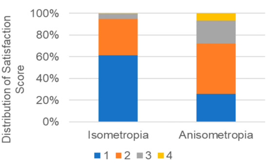 Distribution of final satisfaction score stratified by isometropia/anisometropia. Final satisfaction scores were significantly poorer in the anisometropia group (p < 0.001, Mann-Whitney U test).