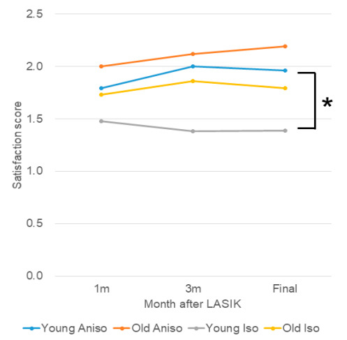 Satisfaction score stratified by anisometropia. The final satisfaction scores of the younger anisometropic group was poorer than the score of the younger isometropic group (* p = 0.002), whereas there was no difference between the older groups. Blue, younger anisotropic group; red, older anisometropic group; grey, younger isometropic group; yellow, older isometropic group.