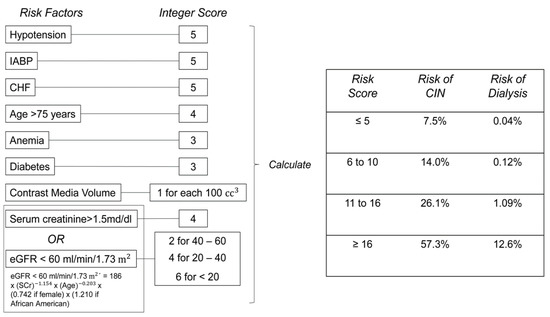 Figure 1. Risk Stratification Score Model designed by Mehran et al. to predict contrast induced nephropathy (CIN) following percutaneous coronary intervention (PCI) [7]. - Yamamoto et al.: CM × SCr/BW [8]