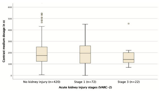 An overview of the procedural characteristics of patients is provided in Table 2. With respect to the secondary endpoints, the CM dose (AKI: 171 ± 136.3 vs. Non-AKI: 157 ± 127 mL; p = 0.968) was neither significantly different in all AKI patients nor between stage one and stage three AKI patients (p = 0.400; Figure 2). None of the models were found to be significantly different between the AKI and non-AKI patients, and the proportion of individuals exceeding the suggested cutoff level of 5 for the CM × SCr/BW ratio was in fact higher in the non-AKI cohort (AKI: 6.4% vs. Non-AKI: 13.6%; p = 0.030). Transfemoral-TAVR patients specifically had a higher incidence of AKI and received a larger CM dosage, but there was still no association between CM volume and AKI when transfemoral-TAVR and transapical-TAVR patients were analyzed separately.