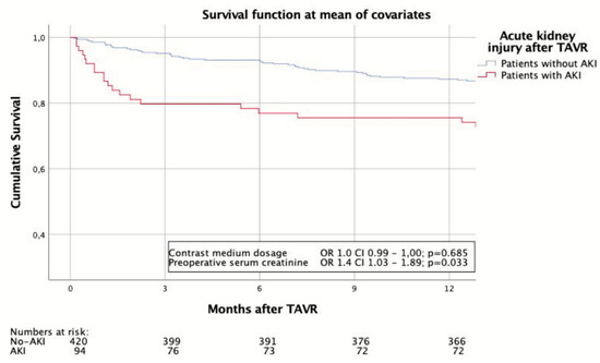 Details regarding the post-interventional outcomes of the two cohorts following TAVR can be seen in Table 3. Major bleeding complication rates were almost double amongst AKI patients (13.8% vs. 7.4%; p = 0.027) in line with the higher rate of RBUs used in this cohort. 30-day mortality was significantly higher among AKI patients (8.5% vs. 1.4%; p = 0.001), and the number of people reaching the 30-day combined safety endpoint was correspondingly lower (56.4% vs. 88.3%; p < 0.001). Procedural success was significantly lower among AKI patients (77.7% vs. 90.7%; p = 0.006) and the need for reoperation was higher for both cardiac (13.8% vs. 7.6%; p = 0.035) and non-cardiac problems (13.8% vs. 6.4%; p = 0.013). After adjusting the Cox proportionate hazards model for covariates, a significant difference in 1-year survival between patients with and without postprocedural AKI was observed. While preprocedural serum creatinine levels were the only predictive factor in this model, the CM dosage had no influence on survival in this model (Figure 3).