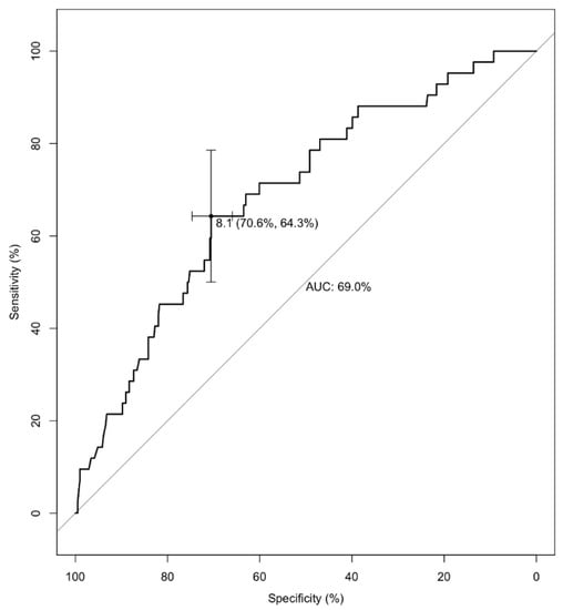 To determine the best threshold of belatacept conversion timing after transplantation to predict the risk of OPI, we performed a ROC analysis (Figure 1). A calculated cutoff value of 8 months was determined to obtain the highest sensitivity and specificity for the development of an OPI (area under the curve (AUC) value = 0.69, specificity 70.6%, sensibility 64.3%). This value was then used in our analysis by replacing the 6-month cut-off value with the 8-month cut-off value.
