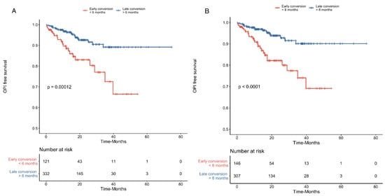 Early conversion to belatacept as a risk factor for an opportunistic infection (OPI). Kaplan–Meier analysis curve of OPI-free survival in kidney transplant recipients converted earlier (<6-months) and later (≥6-months) to belatacept (A) and of recipients converted to belatacept before <8-months and after ≥8-months (B).