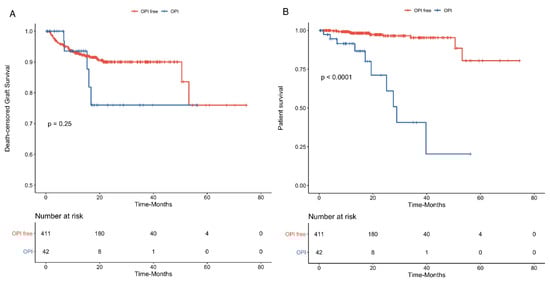 Outcomes of opportunistic infections (OPI) on graft loss and patient survival. Kaplan–Meier analysis curve, showing death-censored graft survival (Panel A) and patient survival (Panel B) rates regarding the occurrence of OPIs (N = 42) or no OPIs (N = 411). OPIs were significantly associated with worse patient survival but did not impact on death-censored graft loss.