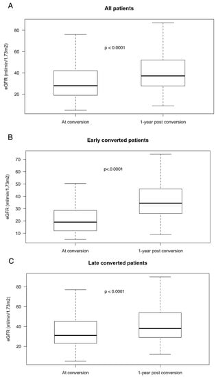 Improvement in renal function at 1-year post-belatacept conversion. Boxplots of eGFR at conversion and at 1-year after conversion to belatacept in all patients (A) N = 453, in patients converted before 6 months (B) N = 121 and in patients converted after 6 months (C) N = 332.