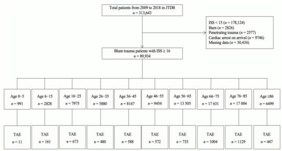 In this study, we used a JTDB dataset that included information from 1 January 2009 to 31 December 2018, which initially yielded data for 313,643 patients. The inclusion criteria for this study were the presence of blunt trauma with an Injury Severity Score (ISS) ≥ 16 and patients who underwent TAE. Patients with burns, those with penetrating trauma, those who were dead on hospital arrival, or those with missing key data were excluded from this study. Figure 1 presents a flow diagram of the patient disposition in this study.
