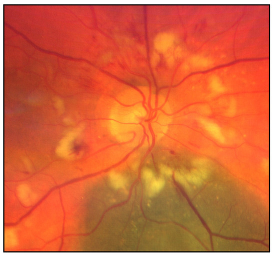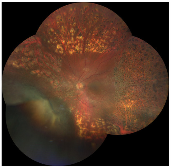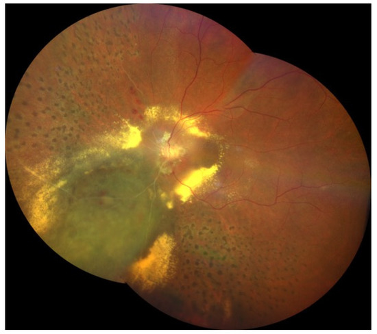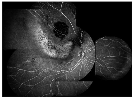 Radiation retinopathy (RR) (Figure 1), better defined as radiation chorioretinopathy, is one of the major complications of eye irradiation, occurring more frequently after irradiation of primary intraocular tumors. It is histopathologically characterized by progressive vascular occlusion, vascular remodeling and chorioretinal inflammation [4,5,6,7,8,9]. This pathologic process is clinically characterized by the appearance of microaneurysms and telangiectasia as well as retinal edema and hard exudates from compromised retinal capillaries. As areas of capillary dropout become confluent, retinal ischemia develops and nerve fiber layer infarctions are visible. Usually, larger vessels are involved later in the course of the disease, with marked vascular sheathing. When there are large or multiple areas of capillary non-perfusion (Figure 4), laser photocoagulation is mandatory (Figure 5) to prevent retinal and disc neovascularization (Figure 6 and Figure 7). Choroidal circulation is also directly compromised, thus suggesting that the term radiation chorioretinopathy better identifies this disorder [7].