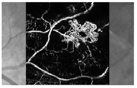 Optical coherence tomography angiography (OCTA) analysis demonstrating perifoveal neovascularization.