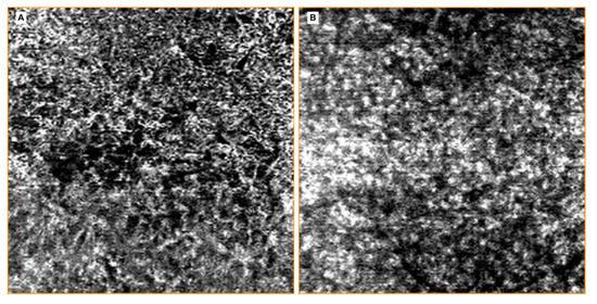 OCTA analysis of the choriocapillary vascular structure in a patient affected by radiation chorioretinopathy in his left eye (A). Choroidal vessels are rarefied and dilatated; “signal void” spots are recorded in the central area. The normal appearance of the choriocapillary vascular structure of the fellow-eye is showed in (B).