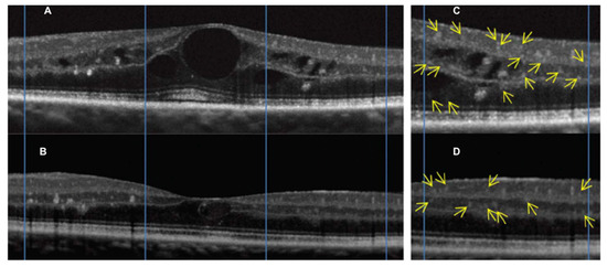 Some papers have documented that massive, chronic cystoid macular edema may lead to disruption of the photoreceptor inner segment/outer segment (IS/OS) junction, one of the OCT parameters correlated with irreversible visual loss [33,34]. Thus, even with resolution of edema and restoration of near normal retinal architecture, patients often fail to regain prior visual acuity. Moreover, OCT analysis of retinal layers enables the documentation of specific reflectivity changes which have been suggested to have a relevant role in different macular diseases, such as age-related macular degeneration, edema secondary to branch vein occlusion, and diabetic retinopathy, namely: Hyperreflective intraretinal foci (Figure 11) [35]. Frizziero et al. documented, by OCT, that these hyperreflective intraretinal foci (also called spots) might be considered a novel, in vivo noninvasive biomarker to better qualify and monitor retinal inflammation in radiation-induced maculopathy [35].