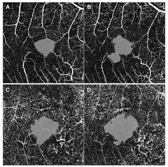Consequently, OCT is currently considered the gold standard to identify and grade radiation macular edema, since its early stages. Various tentatives have been done to classify radiation maculopathy by OCT. Horgan et al. in 2010, proposed a classification of RM using Stratus OCT to grade the amount of macular edema [10]. The first limitation of this classification is the use of just a qualitative approach that may give rise to ambiguity. Furthermore, a second limitation of this study is that atrophic macular changes were not considered. Veverka et al. proposed another classification using ophthalmoscopic, OCT and OCTA findings, to consider both cystoid macular edema grading and macular ischemia [36]. They found that OCTA is able to display foveal avascular zone (FAZ) enlargement (Figure 12) and capillary dropout (Figure 13) in RM before the appearance of signs at ophthalmoscopy or OCT imaging. Unfortunately, this classification is based on just seven cases, without a formal statistical correlation with visual acuity.