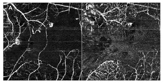 OCTA imaging of the superficial (A) and deep (B) capillary plexuses showing capillary dropout.