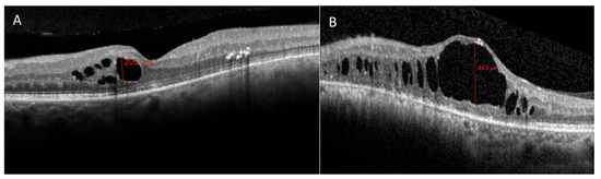 OCT imaging of patients affected by radiation maculopathy at different disease stages. (A) A patient affected by a relatively early-stage radiation maculopathy characterized by evident cystoid macular edema, having the vertical thickness of the largest macular cyst of 208 μm, and by the absence of the IS/OS layer disruption and RPE central atrophy (C208, J0, A0). (B) A patient characterized by an advanced stage radiation maculopathy characterized by evident cystoid macular edema having the vertical thickness of the largest macular cyst of 443 μm and by the presence of both the IS/OS layer disruption and RPE atrophy (C443, J1, A1).
