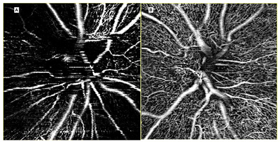 Our group recently demonstrated that OCTA is an accurate and non-invasive method to analyze the peripapillary vascular changes secondary to RON. Both vessel area density and vessel length fraction were reduced, showing that vascular remodeling is not only characterized by a reduction of peripapillary perfusion but also by a reduction in the capillary length and number (Figure 15) [49].