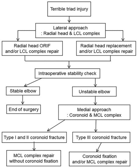 The operative treatment of the terrible triad injuries includes radial head fixation or replacement, coronoid fixation, and lateral collateral ligament (LCL) complex repair [,,,,,,,,]. If the elbow is unstable, then medial collateral ligament (MCL) complex repair or hinged external fixation are sometimes required [,,]. The most debatable issues for the treatment of these injuries are: (i) which structures to repair and (ii) what steps should be taken in order to reconstruct fractures and ligamentous injuries. Many surgeons have proposed their own treatment algorithms that they believe to contribute most substantially to elbow stability [,,,,,,,]. While a literature review revealed consensus in the requirement for the reconstruction of the radial head fracture and LCL complex tear, opinions vary as to whether coronoid process fractures require repair []. Although most of the studies recommended the reconstruction of both radial head and coronoid process fractures in terrible triad injuries [,,,,], recent cadaveric and clinical studies have reported that type I or II coronoid process fractures according to Regan–Morrey classification [] can be stable if the radial head and ligamentous complexes are completely restored [,]. Papatheodorou et al. [] reported on a series of 14 terrible triad injuries that were treated without fixation for type I or II coronoid fractures and achieved excellent results without any residual instability.