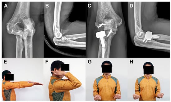 A 68-years old woman (Case 1) with terrible triad injury. Plain radiographs at the time of initial trauma reveal radial head and neck comminuted fracture, coronoid tip fracture, and elbow dislocation (A,B). Plain radiographs and clinical photos at 47 months after surgery reveal excellent radiographic and clinical outcomes (C–H).