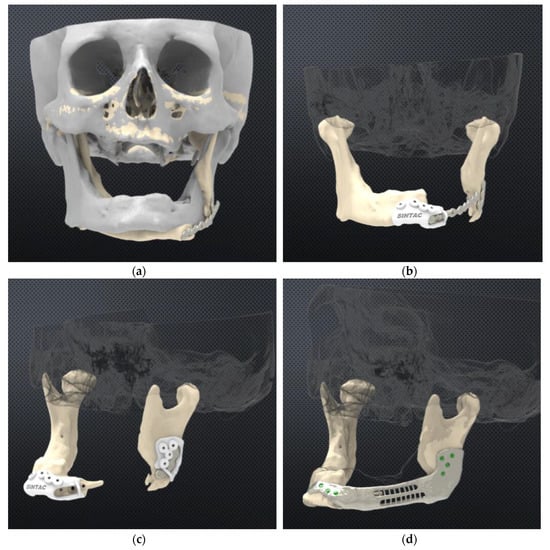 Digital Imaging and Communications in Medicine (DICOM) format data were processed using the simulation software. Using this software, it was possible to create 3D virtual models of the maxillofacial skeleton. The software allowed the surgeon to plan mandibular osteotomies. Mandibular-cutting polyamide guides were used to reproduce the osteotomy site, as virtually planned. Reconstructive titanium plates were manufactured by a direct metal laser sintering method: a metal powder was fused into a solid component and melted locally using a focused laser beam. The solid-to-layer files of the guide and plate were then manufactured by direct metal laser sintering (SINTAC s.r.l., Biomedical Engineering, Trento, Italy) using an EOSINT M280 system (Electro-Optical Systems, GmbH, Munich, Germany).