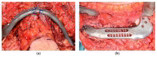 Although this procedure is feasible and reproducible in most patients, at times, poor oncological prognosis or poor performance status, together with other relative or absolute vascular contraindications, will force surgeons to consider other reconstructive solutions [,]. In these cases, the main alternative to reconstructing a mandibular defect is represented by bridging plates combined with soft tissue flaps, especially when the condyles are bilaterally preserved [,].