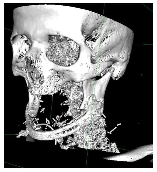 - Bolognesi, F.; Tarsitano, A.; Cicciù, M.; Marchetti, C. Surgical Management of Primary Chronic Osteomyelitis of the Jaws: The Use of Computer-Aided-Design/Computer-Aided Manufacturing Technology for Segmental Mandibular Resection. J. Craniofac. Surg. 2020, 31, e156–e161. [Google Scholar] [CrossRef]
