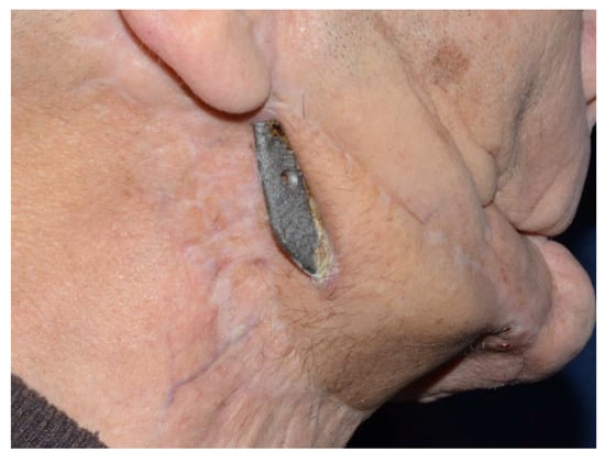 All patients except one (Figure 6) were alive and without exposure of the CBMP at the time of writing. The single case with plate exposure was a patient with an important cutaneous retraction due to the radiotherapy and scars of previous surgery. For this reason, an ALT free flap was performed, but probably the quantity and quality of tissue was not satisfactory.