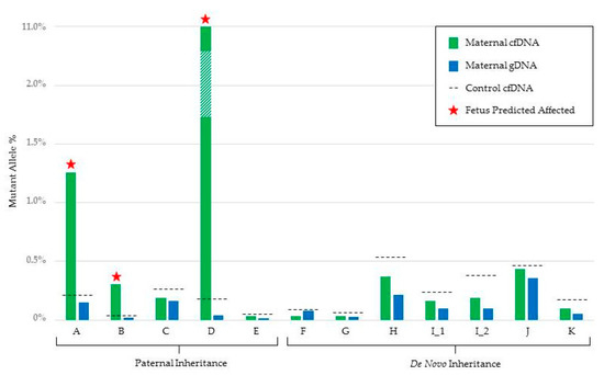 Graphical representation of the mutant allele % detected in both maternal cfDNA (green) and maternal gDNA (blue) for each family tested by amplicon-based MPS. The maternal cfDNA mutant allele % is an average of two duplicate samples. The maximum mutant allele % detected in the five control cfDNA samples is also shown (black dotted line). Tests reported as predicted to be affected are indicated with a star.