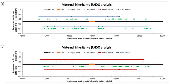 Graphic representation of NIPD by relative haplotype dosage analysis (RHDO) result for (a) Family L and (b) Family M at risk of maternal inheritance of retinoblastoma. Haplotype blocks are represented by contiguous arrows spanning a 5 Mb genomic region on chromosome 13 (black line) containing RB1 (orange bar). Red arrows indicate the fetus has inherited the mutated maternal (M-ma) allele. Blue arrows indicate the fetus has inherited wild-type (N-ma) alleles. The position of informative single nucleotide polymorphisms (SNPs) used to identify haplotype blocks is shown for both alpha (green triangles) and beta (green crosses) SNPs.