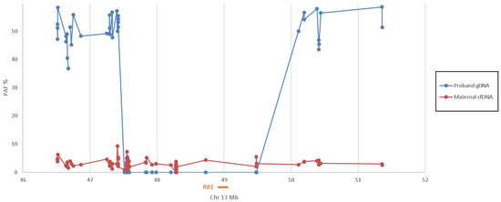 Graphic representation of the paternal allele frequency (PAF%) across the 5 Mb region of chromosome 13 containing RB1 (orange bar) within the previous affected child (proband) gDNA (blue line) and maternal cfDNA (red line) of Family N. The affected child is hemizygous for chr13:47,515,019–49,482,240. The maternal cfDNA had a calculated fetal fraction of 6% and an average of 2.83% paternal alleles across the region, indicating that the fetus is unaffected.