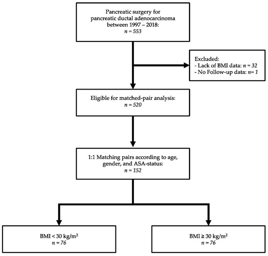 Obesity has become a pandemic affecting more than 400 million people worldwide with the incidence rising [1,2,3,4]. Major complications of obesity are cardiovascular diseases, diabetes mellitus type 2 and the development of several cancers, including pancreatic ductal adenocarcinoma (PDAC) [5,6,7]. PDAC is a devastating malignancy with a rate of overall survival (OS) of about 5%. The aging and growing population is leading to an increase in the rate of pancreatic cancer diagnoses. Surgery and multimodal treatment remain the only curative therapy, but unfortunately, only 20% of patients are candidates for surgery at the time of diagnosis. Despite advances in surgical techniques, perioperative morbidity and mortality rates remain high in pancreatic surgery [8,9]. In obese patients, surgical therapy and perioperative management are even more challenging due to the coexistence of several comorbidities and excessive fat tissue [10]. In the past, several studies have indicated that pancreatectomy for PDAC in obese and overweight patients is associated with high postoperative morbidity and mortality rates [11,12,13,14]. However, the evidence is conflicting as other studies have showed no increased risk of adverse postoperative outcomes in these patients [15,16,17]. Another subject of ongoing debate is the impact of obesity on OS in PDAC. Some studies have reported a poor survival rate in obese patients with PDAC, while others have reported a survival benefit in overweight patients [17,18]. Additionally, the studies reporting on the long-term outcomes regarding a linkage between pancreatic cancer and obesity have employed heterogeneous definitions for obesity although the World Health Organization (WHO) has defined obesity as a body mass index (BMI) level ≥30 kg/m2. Furthermore, the impact of obesity on outcomes after pancreatic resections has been analyzed in subgroups including patients with benign lesions [18,19,20,21,22,23,24,25,26]. Given the conflicting data and the global burden of obesity and PDAC, the aim of the present study was to analyze the impact of obesity on postoperative outcome and survival following surgical therapy in patients with PDAC.