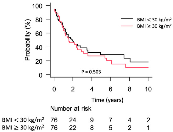 The median follow-up time was 12 months (interquartile range: 3–26 months). During this period, a total of 84 patients died. Patients with obesity had a median survival of 19 months (95% CI: 12–30 months) compared to 24 months (95% CI: 15–42 months) in patients without obesity (p = 0.503; Figure 2). We further stratified the cohort of obese patients according to the definition of obesity grading by the WHO. Patients with grades II and III had an impaired survival outcome compared to the control group but this was not statistically significant (BMI 30–35 kg/m2: 26 months (95% CI: 12–38 months); BMI 35–40 kg/m2: 16 months (95% CI: 7–16 months); BMI ≥ 40 kg/m2: 14 months (0–14 months) p = 0.355) (Figure S1, Supplementary Materials). To investigate a potential survival difference in obese patients with surgery of curative intent, we performed further subgroup analysis by excluding patients with palliative bypass surgery (Figure S2). There were no significant differences in OS between the groups (BMI ≥ 30 kg/m2: 18 months (95% CI: 12–29 months) vs. BMI < 30 kg/m2: 25 months (95% CI: 16–43 months), p = 0.239).